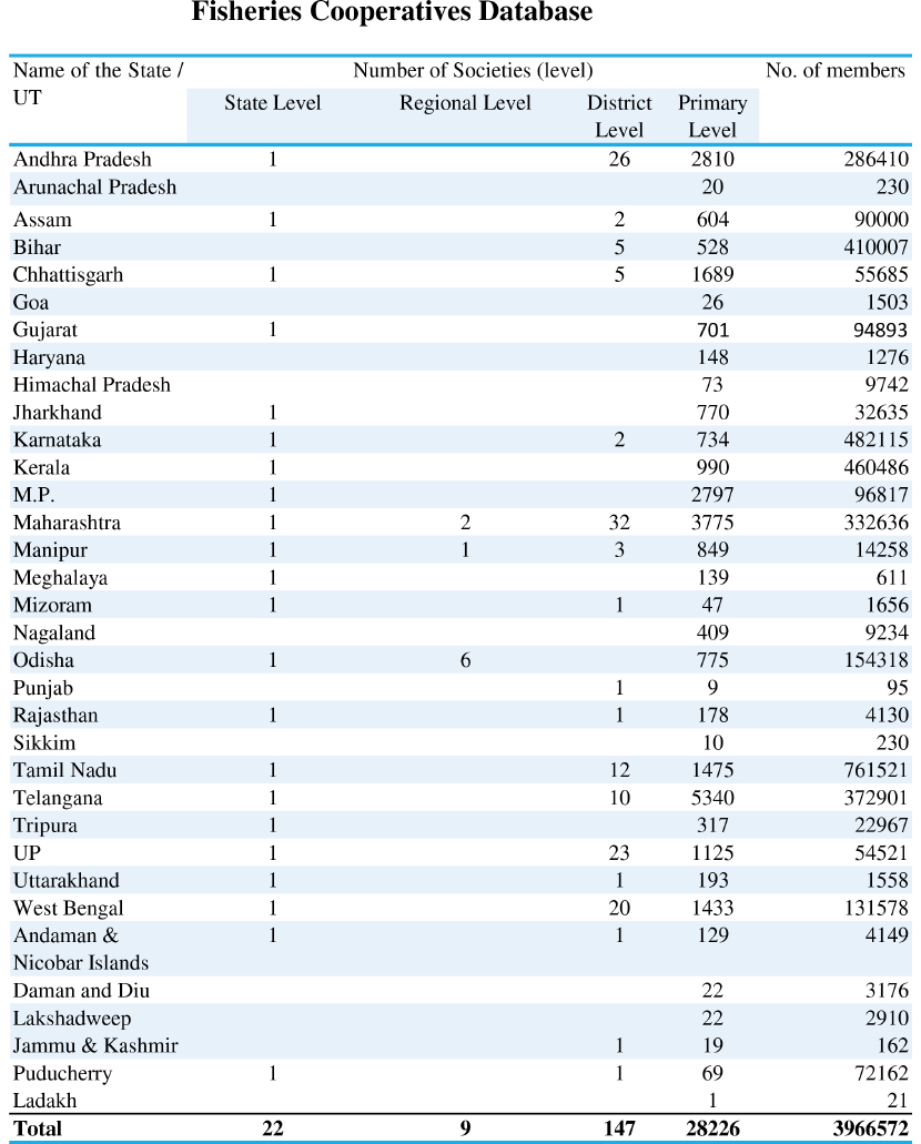 The Ministry of Fisheries, Animal Husbandry and Dairying, Department of Fisheries, Government of India had assigned a task to collect the data of primary fisheries cooperatives alongwith the details of their status, membership and facilities available with these cooperatives. FISHCOPFED took the challenge and completed nationwide survey of primary fisheries cooperatives. The computerized data report has also been prepared. FISHCOPFED has also prepared database for all functional fishery cooperatives. Details are as under: